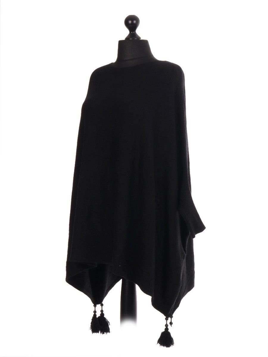 Elevate your wardrobe with the Italian Batwing Tassels Poncho in black. Crafted with expert attention to detail, this poncho features a flowing batwing silhouette that offers both comfort and style. The delicate tassel accents add a refined touch, making it a versatile piece for layering in cooler weather. Perfect for those seeking a sophisticated yet relaxed look, this poncho combines Italian design elegance with practical wearability.