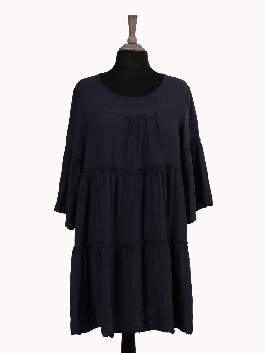 Elevate your wardrobe with the Navy Italian Bell Sleeves Tiered Smock Top, expertly crafted for a refined yet relaxed silhouette. Featuring elegant bell sleeves and a tiered smock design, this top offers both comfort and a flattering fit. Its lightweight fabric ensures breathability, making it ideal for transitional seasons. Perfect for pairing with tailored trousers or casual jeans, this versatile piece adds a sophisticated touch to any outfit.