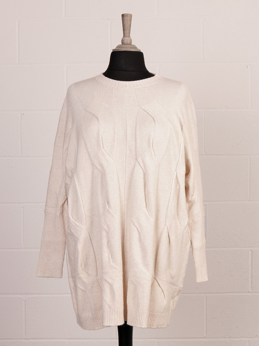 Crafted with fine Italian yarn, this beige cable knitted batwing jumper combines traditional knitting techniques with a modern silhouette. The batwing sleeves offer a relaxed fit, enhancing comfort and ease of movement, while the intricate cable pattern adds texture and visual interest. Ideal for layering, this jumper provides warmth without bulk, making it a versatile addition to any expert wardrobe seeking both style and functionality.
