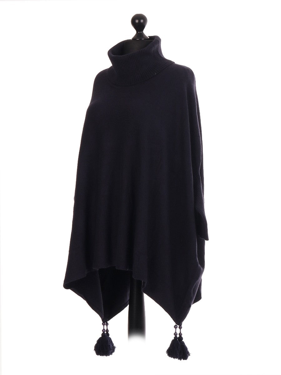 Elevate your wardrobe with the navy Italian Cowl Neck Batwing Tassels Poncho, expertly crafted for both style and comfort. Its draped cowl neck and flowing batwing sleeves offer a flattering silhouette, while the delicate tassel detailing adds a refined touch. Perfect for layering, this poncho combines Italian design elegance with versatile wearability, making it an essential piece for sophisticated, effortless dressing.