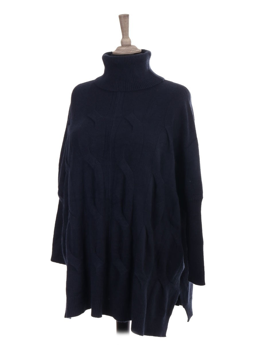 Crafted with expert attention to detail, this navy Italian Cowl Neck Cable Knit Batwing Jumper combines timeless cable knit patterns with a relaxed batwing silhouette for superior comfort and style. The cowl neck adds warmth and a sophisticated touch, making it an ideal layering piece for cooler seasons. Its premium knit fabric ensures durability and a refined finish, perfect for elevating both casual and smart-casual wardrobes.
