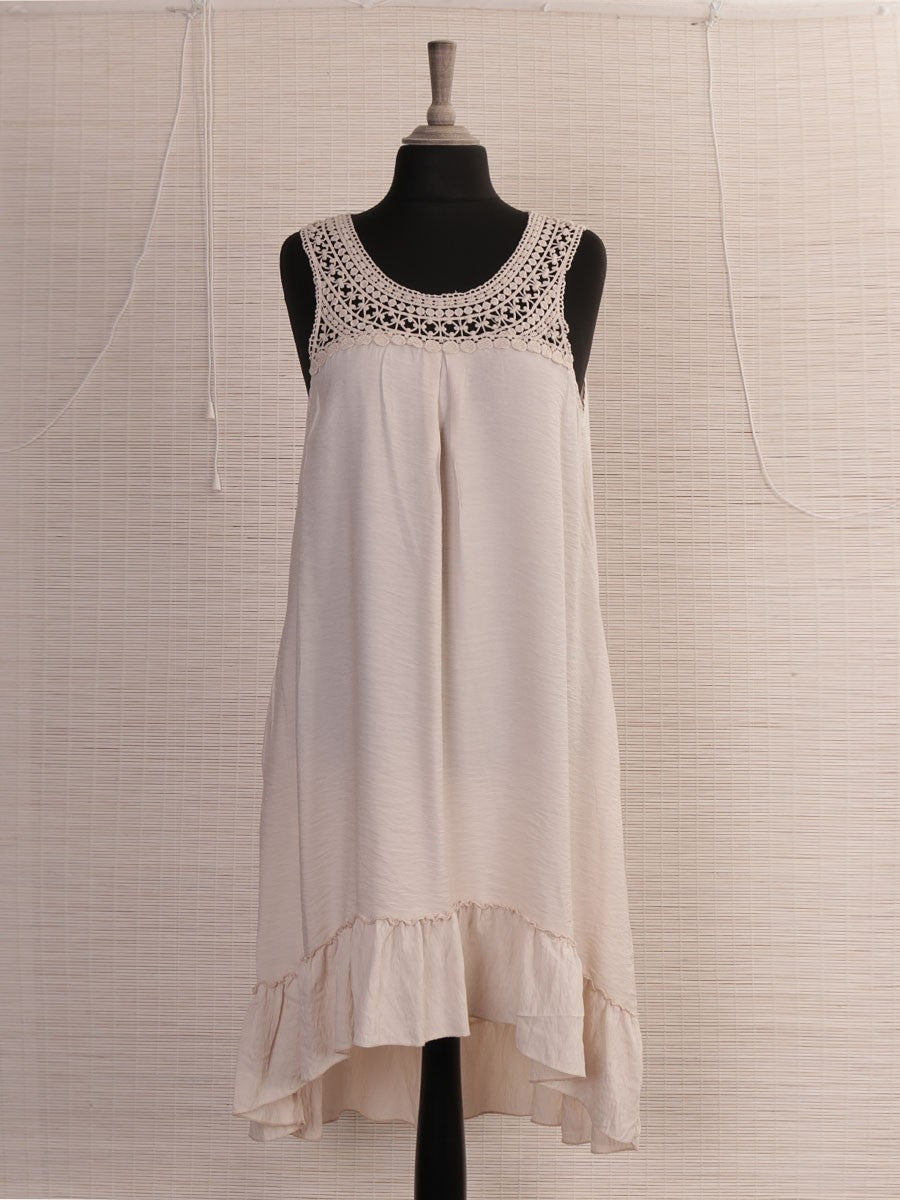 Elevate your wardrobe with this beige Italian Crochet Neck Dress, featuring delicate frilled hem detailing and a stylish dip hem silhouette. Crafted to combine classic crochet craftsmanship with modern design, it offers a refined yet contemporary look. The intricate neckline adds a touch of elegance, while the flowing dip hem enhances movement and visual interest, making it perfect for both casual and dressier occasions. This dress exemplifies sophisticated Italian design, ensuring you stand out with timeless style and expert tailoring.