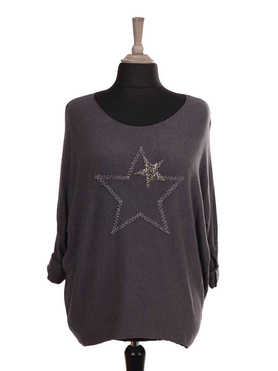Elevate your wardrobe with this Charcoal Italian Diamante and Embroidered Star Detail Knitted Top. Crafted with fine Italian knitting techniques, it features intricate diamante embellishments and a distinctive embroidered star, combining luxury with contemporary style. Perfect for adding a refined yet playful touch to your outfit, this top offers both comfort and standout design for a sophisticated look.