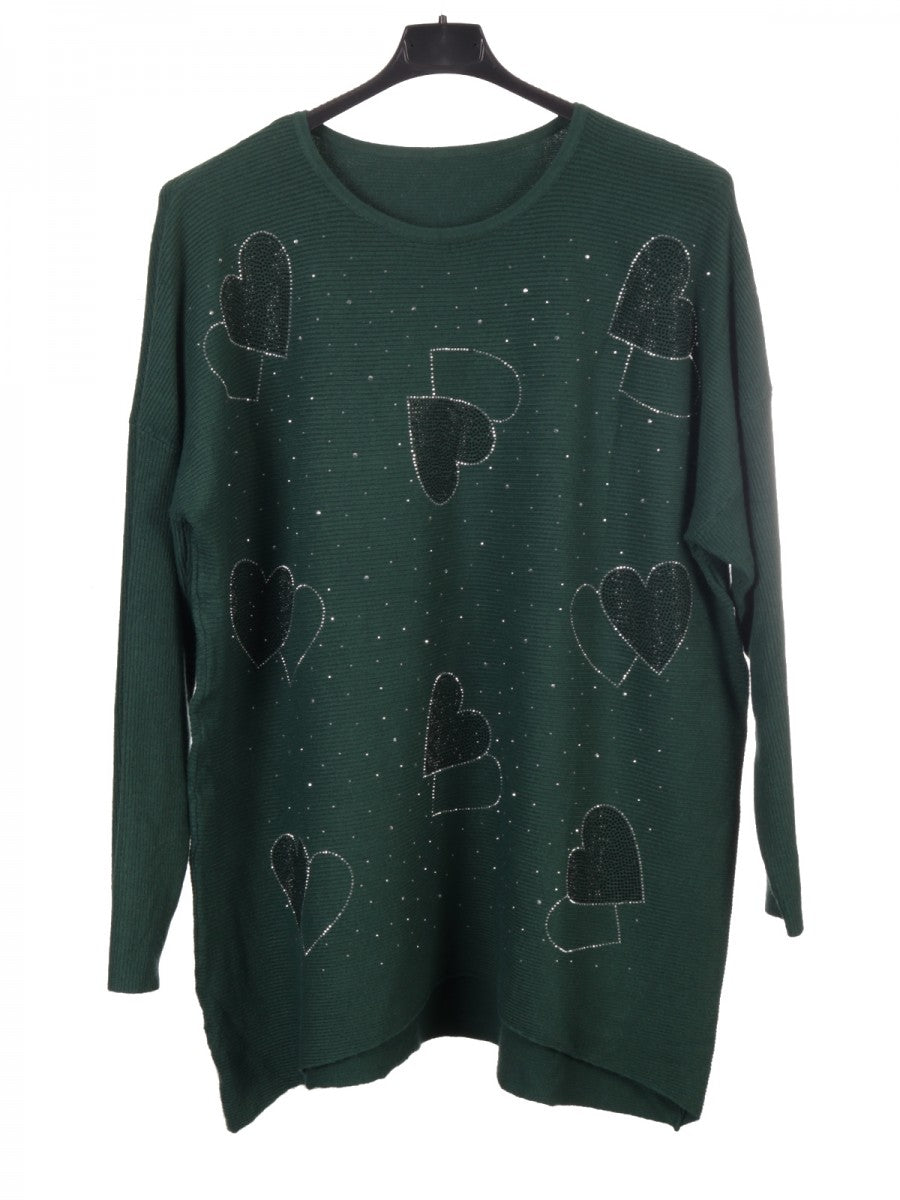 Elevate your knitwear collection with this Hunter Green Italian Diamante Heart Detail Ribbed Knitted Jumper. Crafted with fine ribbed knitting, it offers a flattering fit and comfortable stretch. The subtle diamante heart embellishment adds a refined touch of elegance, making it perfect for both casual and dressier occasions. This jumper combines quality Italian craftsmanship with timeless style, ensuring durability and a sophisticated look season after season.