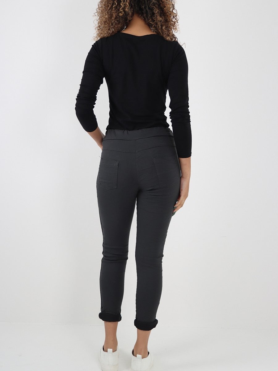 These Charcoal Italian Diamante Stripe Elasticated Trousers combine refined style with exceptional comfort. Crafted with a subtle diamante stripe, they offer a sophisticated shimmer that elevates any outfit. The elasticated waistband ensures a perfect fit and ease of movement, making them ideal for both professional and casual settings. Expertly designed for versatility, these trousers provide a polished look without compromising on comfort.