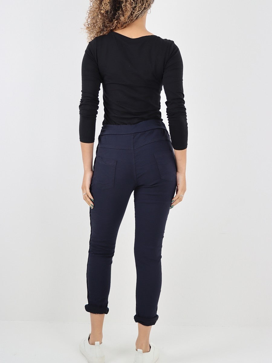 These Navy Italian Diamante Stripe Elasticated Trousers combine refined style with exceptional comfort. Crafted with a subtle diamante stripe, they offer a sophisticated shimmer that elevates any outfit. The elasticated waistband ensures a perfect fit and ease of movement, making them ideal for both professional and casual settings. Expertly designed for versatility, these trousers provide a polished look without compromising on comfort.