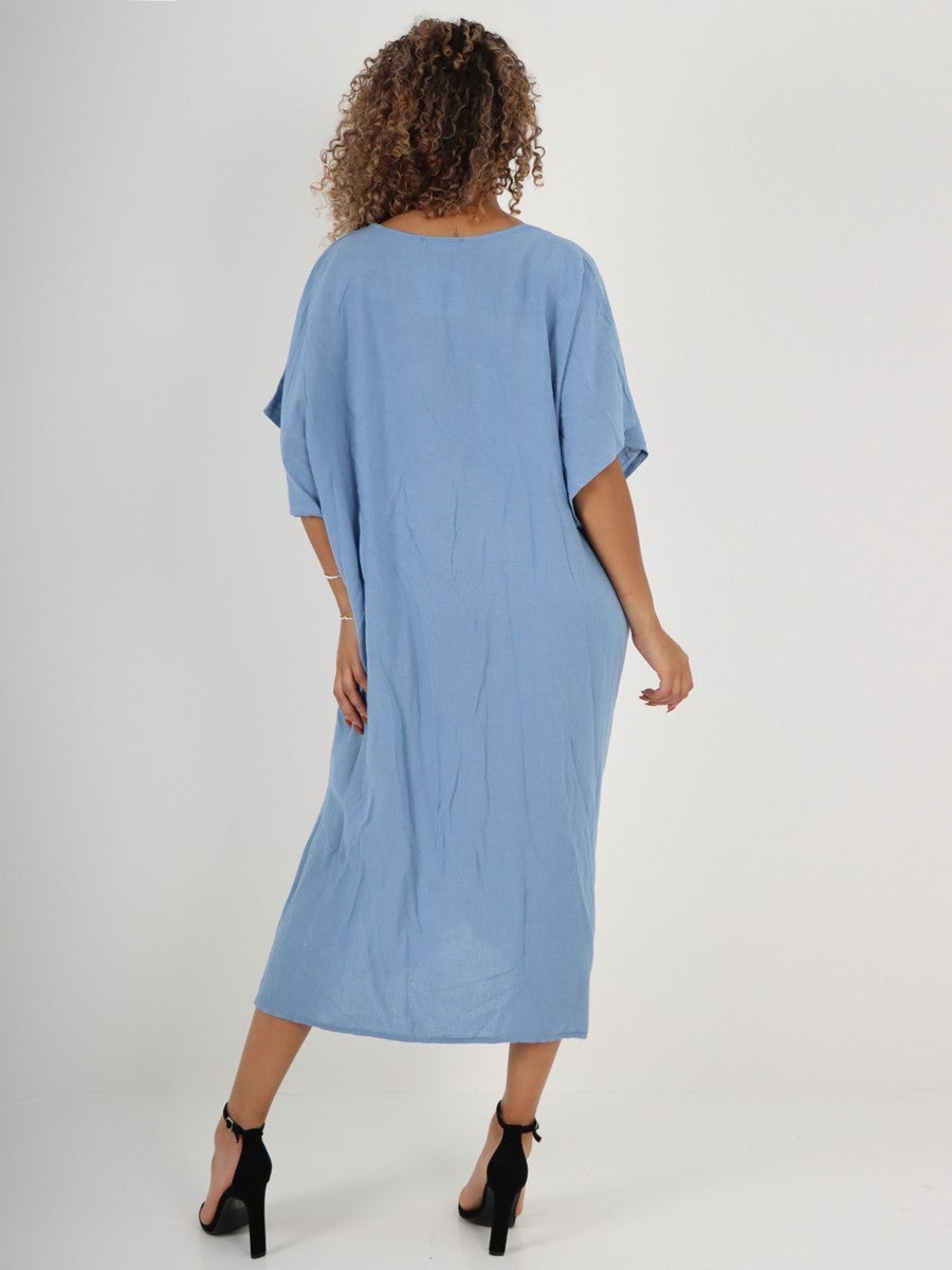 Crafted from breathable linen, this denim Italian drawstring dress features a flattering side split for ease of movement and adjustable fit. Its minimalist design combines comfort with elegance, making it ideal for warm-weather occasions or casual sophistication. The drawstring detail allows personalized shaping, enhancing silhouette while maintaining effortless style.
