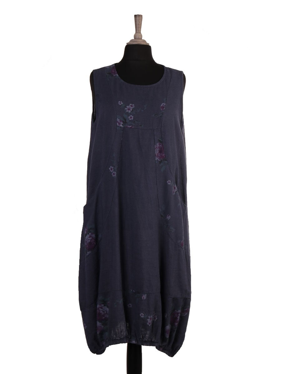 This navy Italian linen dress features a relaxed lagenlook silhouette with a delicate floral pattern and an elasticated hem for a comfortable, flattering fit. Crafted from breathable linen, it offers natural comfort and effortless style, ideal for warm weather or layered looks. The elasticated hem adds subtle shape while maintaining ease of movement, making it a versatile addition to any wardrobe.