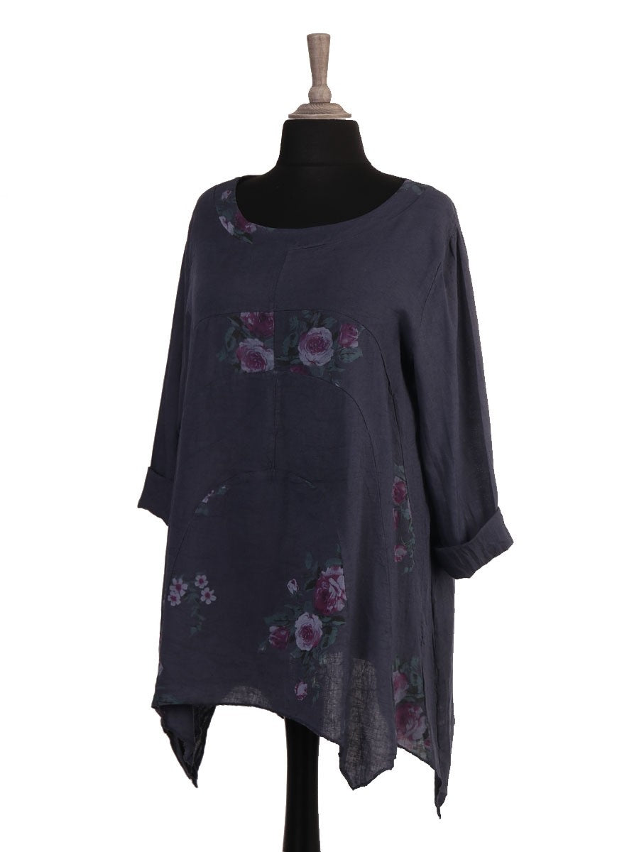 Elevate your wardrobe with this navy Italian Floral Print Linen Tunic Top, featuring an asymmetric hem for a modern silhouette. Crafted from breathable linen, it offers comfort and style ideal for warm weather. The delicate floral pattern adds a touch of Italian elegance, making it perfect for both casual outings and refined occasions. Its unique cut enhances movement and flatters various body shapes, combining expert design with effortless sophistication.