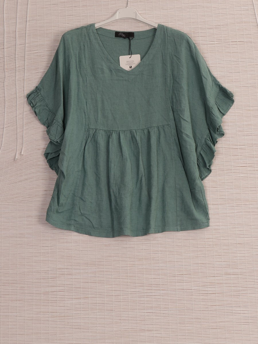 Elevate your wardrobe with the Mint Italian Frilled Sleeves Linen Batwing Top, expertly crafted from breathable linen for all-day comfort. Its batwing silhouette offers a relaxed yet sophisticated fit, while the delicate frilled sleeves add a refined, feminine touch. Perfect for both casual and elegant occasions, this top combines Italian design finesse with versatile wearability.