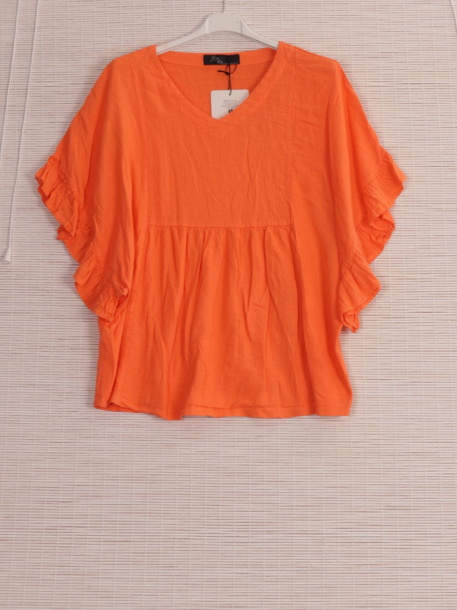 Elevate your wardrobe with the Orange Italian Frilled Sleeves Linen Batwing Top, expertly crafted from breathable linen for all-day comfort. Its batwing silhouette offers a relaxed yet sophisticated fit, while the delicate frilled sleeves add a refined, feminine touch. Perfect for both casual and elegant occasions, this top combines Italian design finesse with versatile wearability.