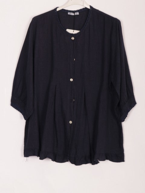 Elevate your wardrobe with this navy Italian Lace Detail Button Through Linen Top, expertly crafted for a refined yet breathable look. The delicate lace accents add a touch of sophistication, while the button-through design offers versatile styling options. Made from high-quality linen, this top ensures comfort and durability, perfect for both casual and elegant occasions. Its tailored fit enhances your silhouette, making it a timeless addition to your collection.