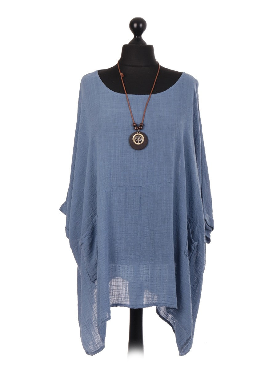 This denim Italian plain batwing top in denim combines effortless style with practical design. Crafted for a relaxed fit, its batwing sleeves offer comfort and freedom of movement. The front pockets add a functional touch, while the included necklace enhances the overall look with subtle elegance. Ideal for both casual and refined occasions, this top delivers versatility and timeless appeal.