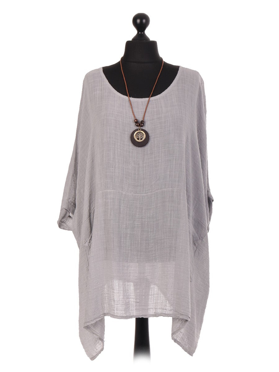 This khaki Italian plain batwing top in light grey combines effortless style with practical design. Crafted for a relaxed fit, its batwing sleeves offer comfort and freedom of movement. The front pockets add a functional touch, while the included necklace enhances the overall look with subtle elegance. Ideal for both casual and refined occasions, this top delivers versatility and timeless appeal.