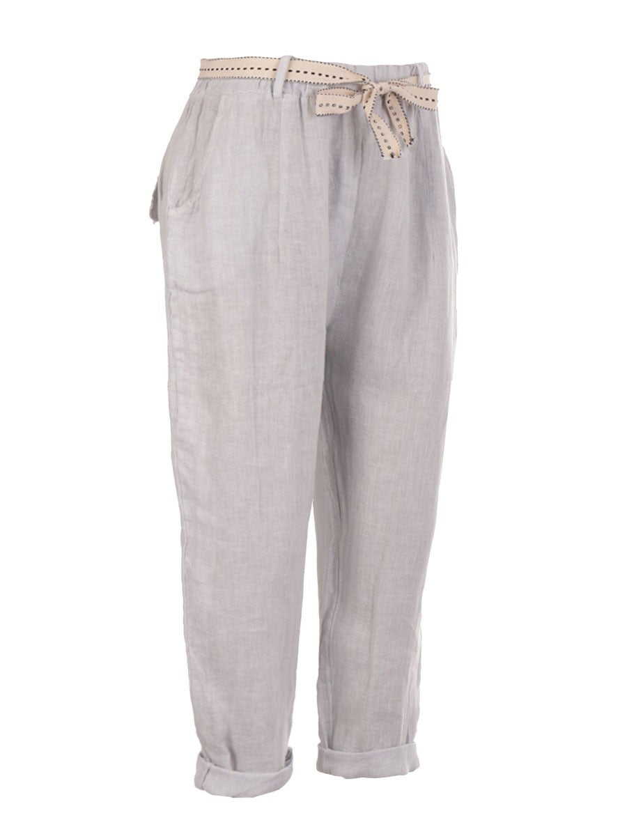 Crafted from premium Italian linen, these light grey plain trousers offer exceptional breathability and comfort. Designed with practical side pockets, they combine functionality with a sleek, minimalist aesthetic. Ideal for warm weather, their lightweight fabric ensures a refined look while keeping you cool throughout the day. Perfect for both casual and smart-casual occasions, these trousers deliver timeless style with expert tailoring.