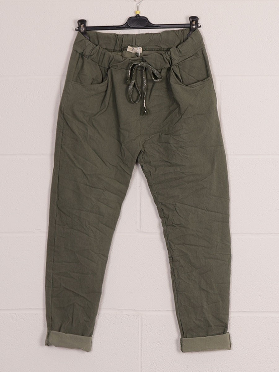 Experience the perfect blend of style and functionality with these Army Green Italian Plain Magic Pants. Crafted for a sleek, tailored look, they feature convenient side pockets for practicality without compromising elegance. Ideal for both professional and casual settings, these pants offer comfort and versatility, making them a smart addition to any wardrobe.