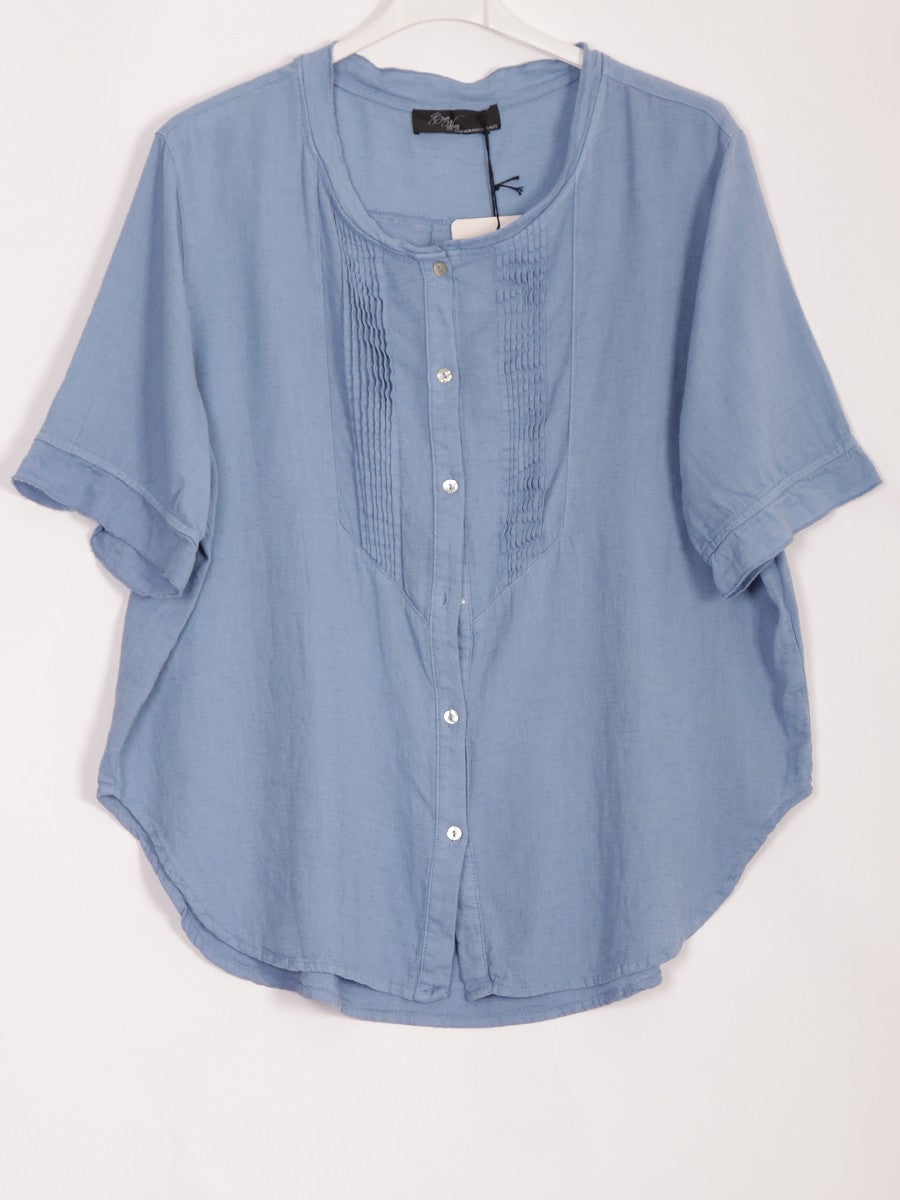 Crafted from breathable linen, this denim Italian pleated front blouse combines timeless elegance with expert tailoring. The delicate pleats enhance its refined silhouette, while the button-through design offers versatile styling options. Ideal for warm weather, it delivers both comfort and sophistication for a polished, professional look.