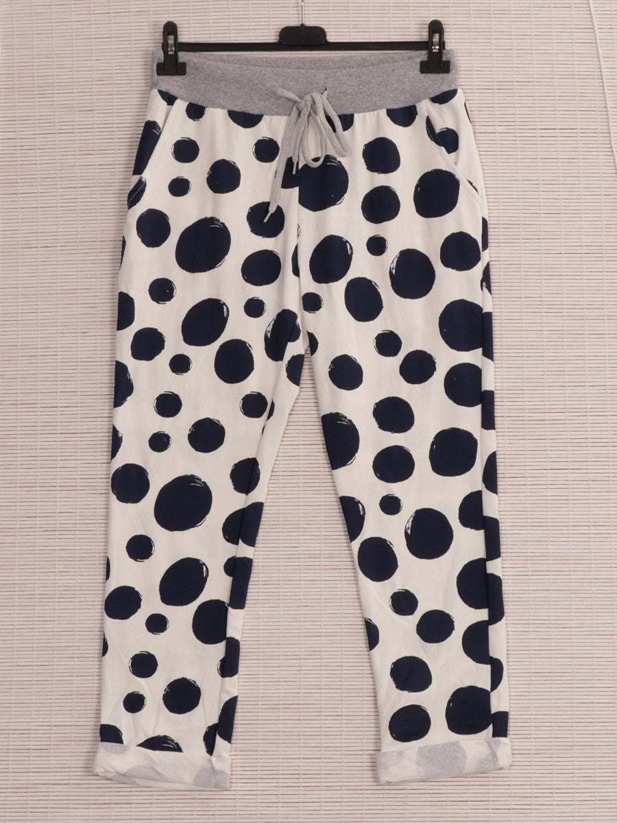 These White Italian polka dot print cotton joggers combine classic style with comfortable wearability. Made from high-quality cotton, they provide breathability and softness, while the distinctive polka dot pattern adds a refined, fashionable touch. Perfect for casual or lounge settings, these joggers offer a sophisticated update to your everyday wardrobe.