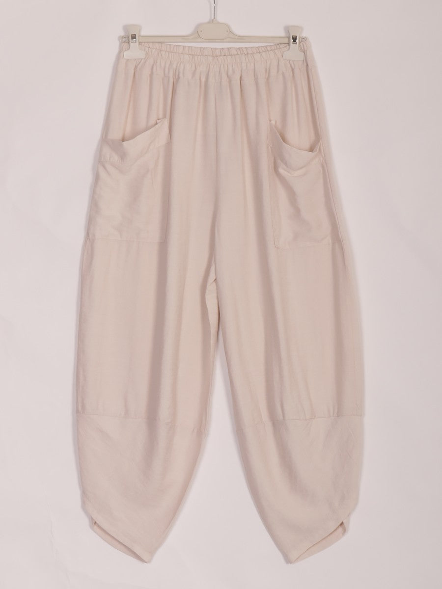 These beige Italian Relaxed Fit Harem Trousers combine comfort with sophisticated style. Designed with a relaxed silhouette and practical front pockets, they offer ease of movement and convenient storage. Crafted to provide a modern yet timeless look, these trousers are ideal for those seeking both functionality and elegance in their wardrobe.