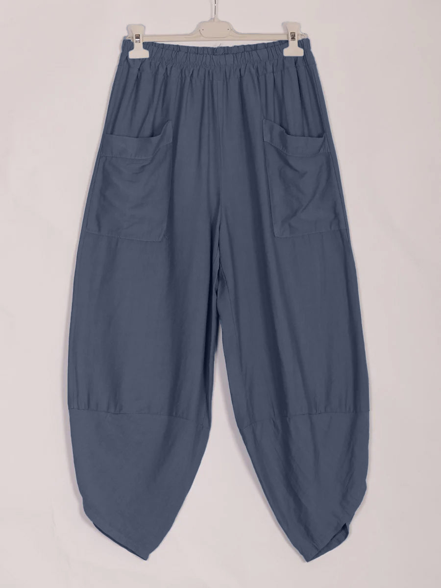 These dark denim Italian Relaxed Fit Harem Trousers combine comfort with sophisticated style. Designed with a relaxed silhouette and practical front pockets, they offer ease of movement and convenient storage. Crafted to provide a modern yet timeless look, these trousers are ideal for those seeking both functionality and elegance in their wardrobe.