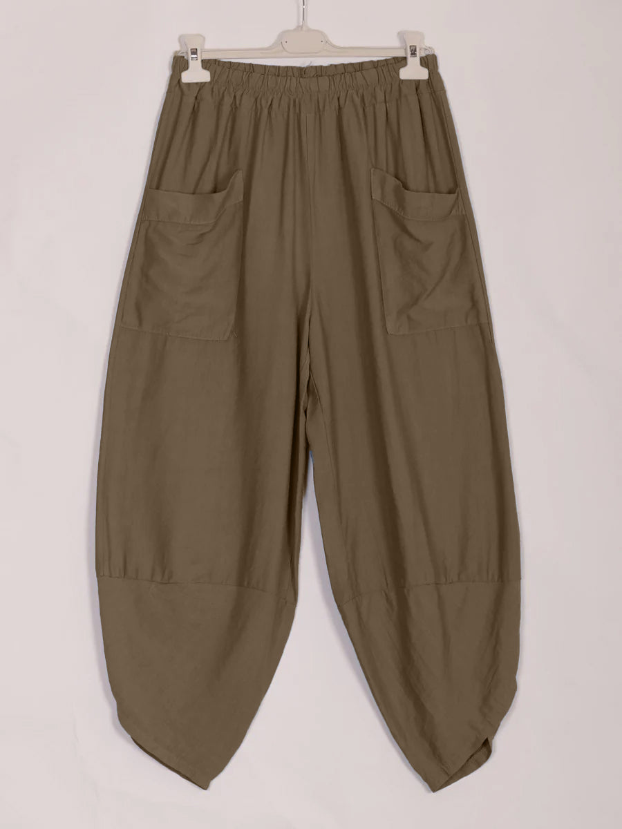 These dark mocha Italian Relaxed Fit Harem Trousers combine comfort with sophisticated style. Designed with a relaxed silhouette and practical front pockets, they offer ease of movement and convenient storage. Crafted to provide a modern yet timeless look, these trousers are ideal for those seeking both functionality and elegance in their wardrobe.