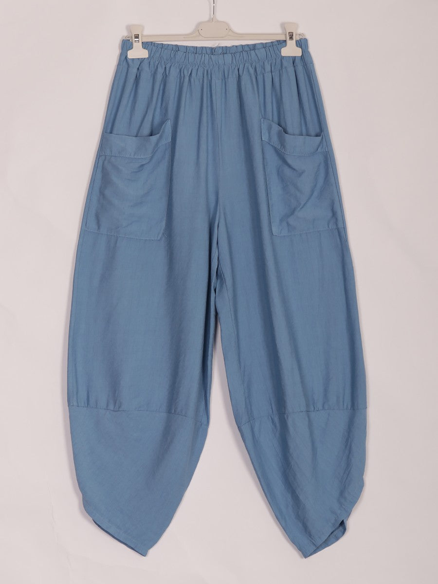 These Denim Italian Relaxed Fit Harem Trousers combine comfort with sophisticated style. Designed with a relaxed silhouette and practical front pockets, they offer ease of movement and convenient storage. Crafted to provide a modern yet timeless look, these trousers are ideal for those seeking both functionality and elegance in their wardrobe.