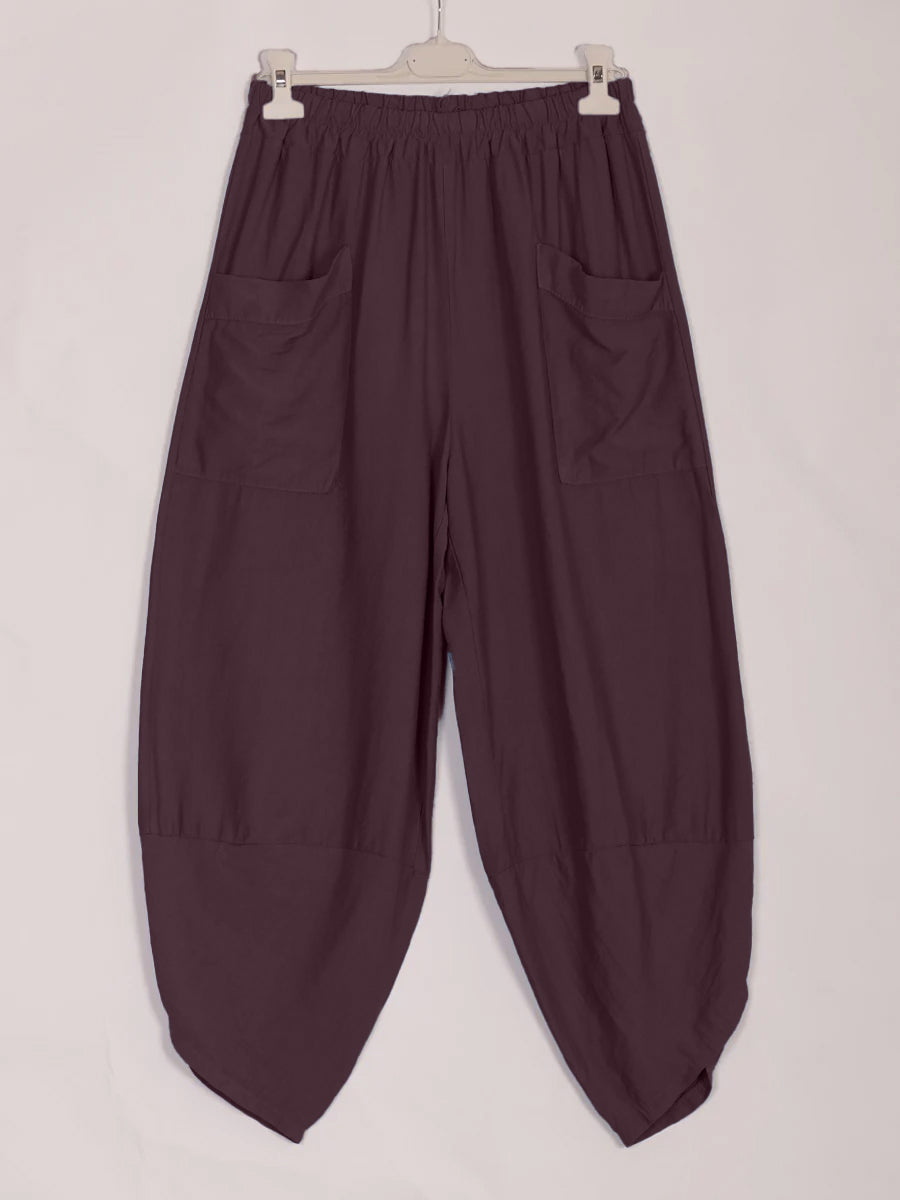 These Plum Italian Relaxed Fit Harem Trousers combine comfort with sophisticated style. Designed with a relaxed silhouette and practical front pockets, they offer ease of movement and convenient storage. Crafted to provide a modern yet timeless look, these trousers are ideal for those seeking both functionality and elegance in their wardrobe.