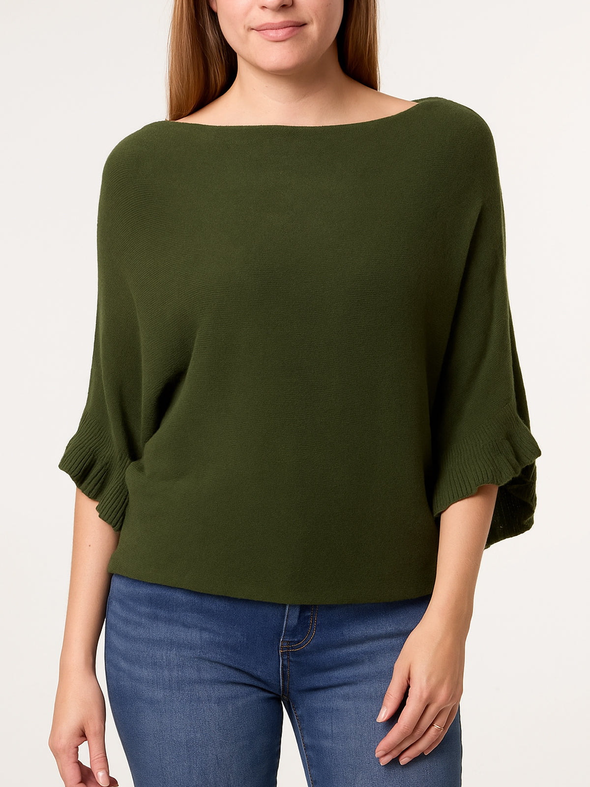 Elevate your wardrobe with the Italian Ruffle Sleeves Batwing Jumper in Army Green. Crafted with a relaxed batwing silhouette, this jumper offers effortless comfort while the delicate ruffle sleeves add a refined, feminine detail. Its versatile army green shade makes it a sophisticated choice for layering, providing both style and practicality in cooler weather. Ideal for those seeking a balance of contemporary design and classic elegance.