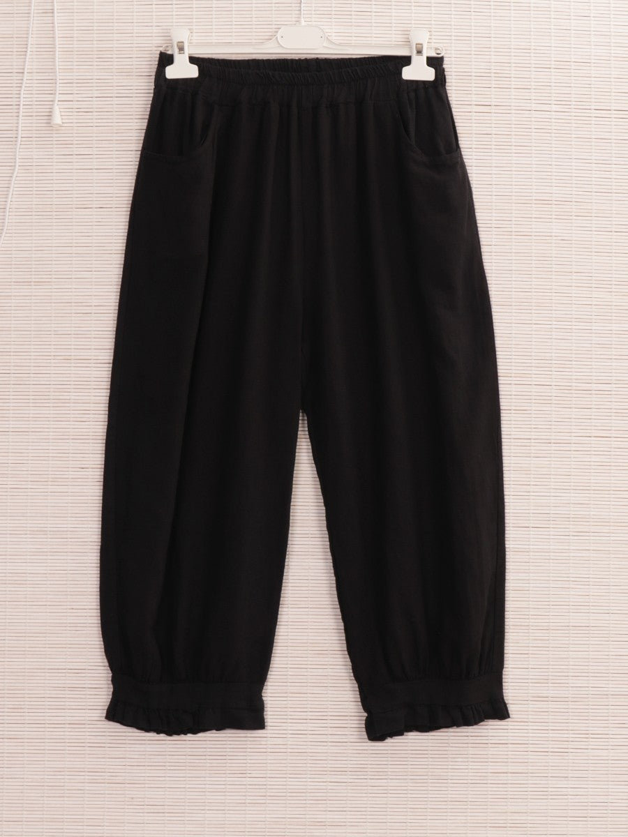 These Italian ruffled hem linen trousers in Black combine relaxed comfort with refined style. Crafted from breathable linen, they offer a lightweight feel ideal for warmer days. The ruffled hem adds a subtle, elegant detail that elevates the classic relaxed fit, making them versatile for both casual and polished looks. Perfect for those seeking effortless sophistication with a touch of Italian flair.
