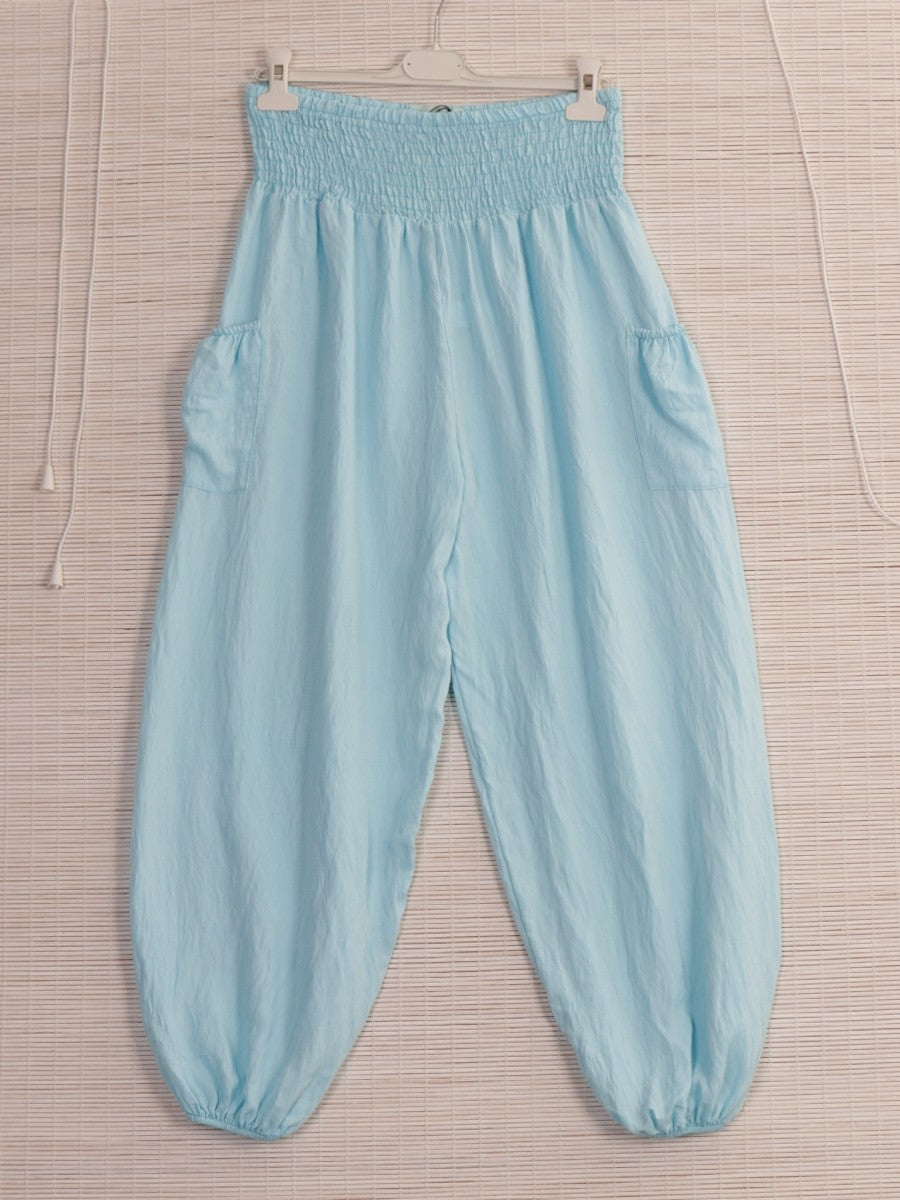 These Italian Side Pockets Detail Harem Pants in sky blue combine traditional comfort with modern style. Crafted for a relaxed fit, they feature practical side pockets that add functionality without compromising the sleek silhouette. Ideal for both casual and refined looks, these pants offer versatility and ease, making them a sophisticated addition to any wardrobe.