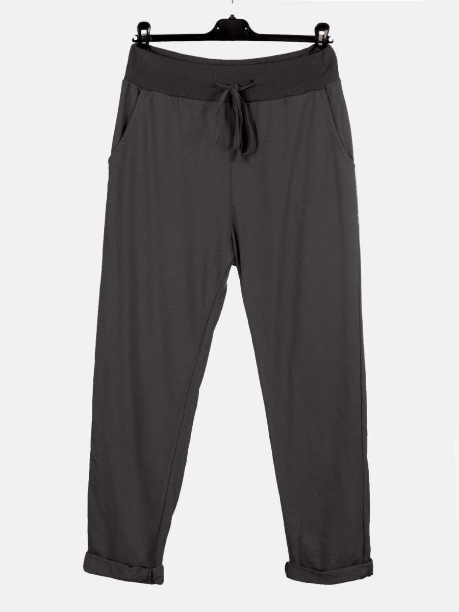 Crafted from high-quality cotton, these Charcoal Italian solid color trousers offer both comfort and durability. Designed with practical side pockets, they provide convenient storage without compromising style. Their tailored fit and classic design make them a versatile addition to any wardrobe, suitable for both casual and formal occasions. Experience refined craftsmanship and timeless elegance with these essential trousers.