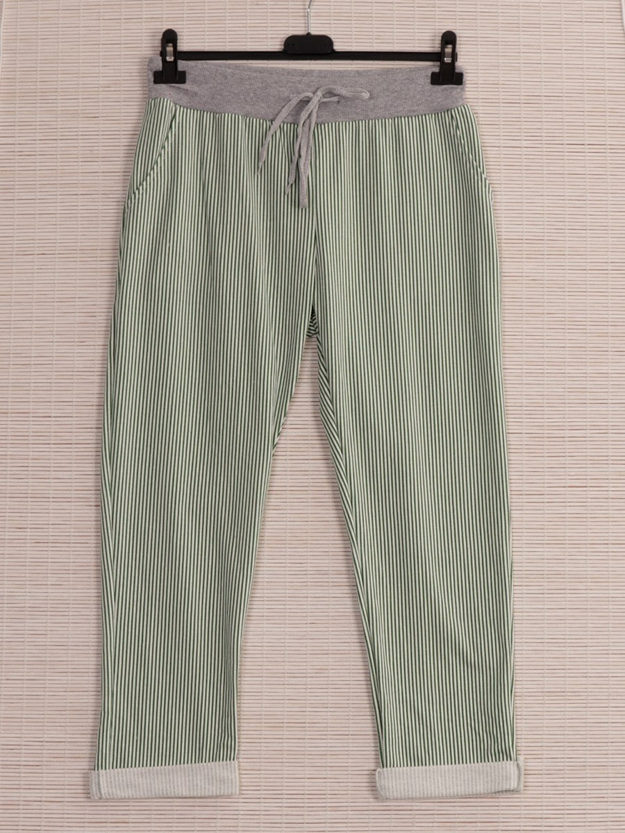 Crafted from breathable cotton, these green Italian striped print trousers combine classic style with exceptional comfort. The refined vertical stripes elongate the silhouette, making them ideal for both casual and smart occasions. Expertly tailored for a flattering fit, they offer versatility and timeless appeal in your wardrobe.