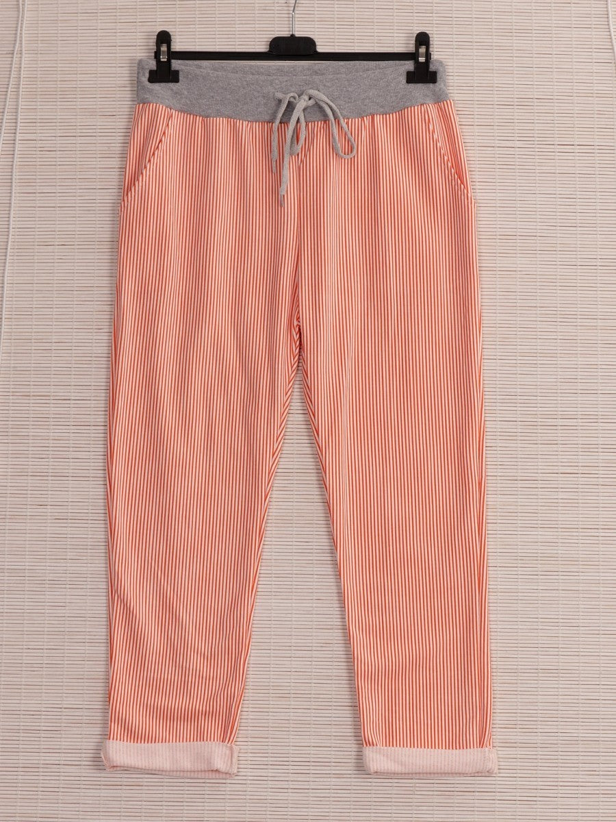 Crafted from breathable cotton, these orange Italian striped print trousers combine classic style with exceptional comfort. The refined vertical stripes elongate the silhouette, making them ideal for both casual and smart occasions. Expertly tailored for a flattering fit, they offer versatility and timeless appeal in your wardrobe.