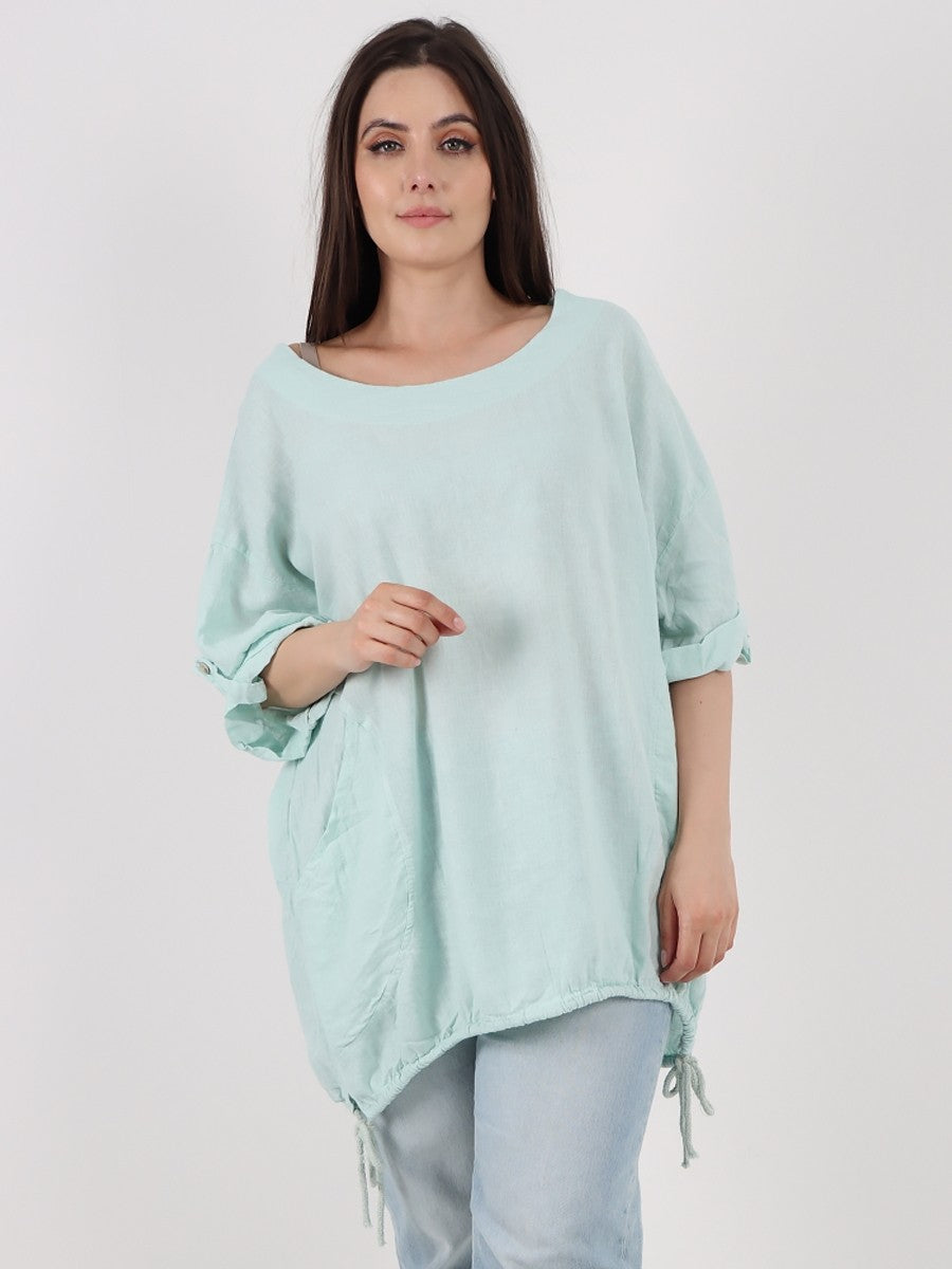 This aqua Italian linen top features stylish turn-up sleeves and a gathered hem, combining classic craftsmanship with contemporary design. Its breathable fabric ensures comfort and durability, making it an ideal choice for sophisticated, everyday wear. The tailored details enhance fit and silhouette, reflecting expert attention to quality and style.