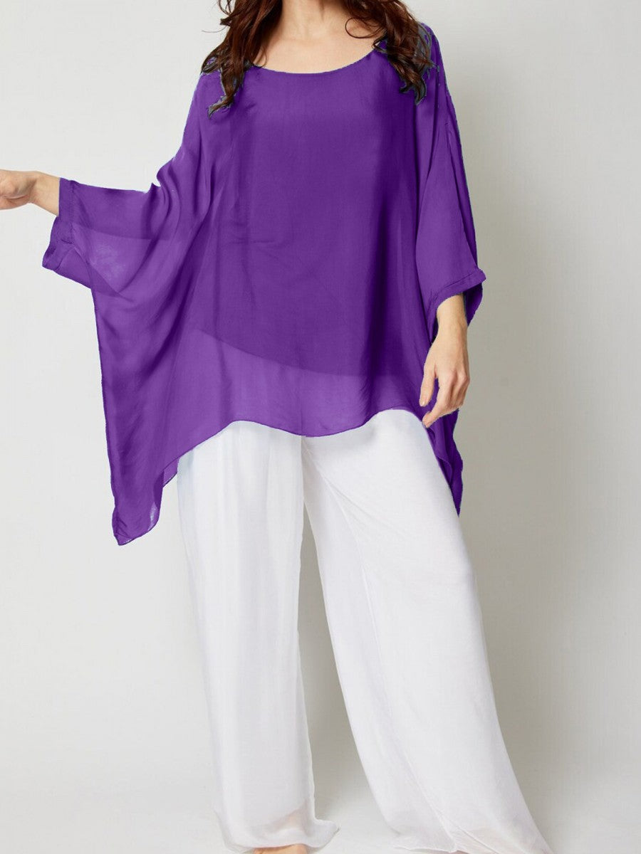 Crafted from luxurious Italian silk, this purple two-layered batwing tunic top offers a refined silhouette with effortless drape. Its plain design highlights the fabric’s natural sheen and smooth texture, making it a versatile piece for sophisticated layering or standalone elegance. Ideal for those seeking comfort without compromising style, this tunic combines expert tailoring with timeless appeal.