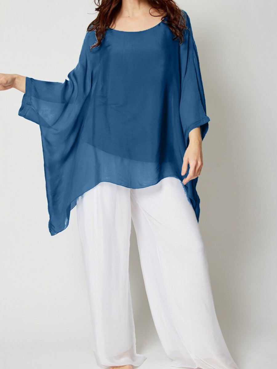 Crafted from luxurious Italian silk, this teal two-layered batwing tunic top offers a refined silhouette with effortless drape. Its plain design highlights the fabric’s natural sheen and smooth texture, making it a versatile piece for sophisticated layering or standalone elegance. Ideal for those seeking comfort without compromising style, this tunic combines expert tailoring with timeless appeal.