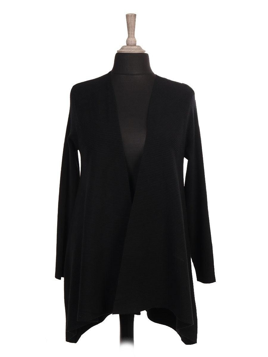 This black Italian Waterfall Open Front Ribbed Cardigan in black combines timeless elegance with versatile comfort. Crafted with a finely ribbed texture, it drapes effortlessly for a flattering silhouette. Its open front design allows easy layering over various outfits, making it an essential piece for transitional weather. The waterfall style adds a sophisticated touch, perfect for both casual and professional settings. Durable and stylish, this cardigan offers expert-level quality and enduring wear.