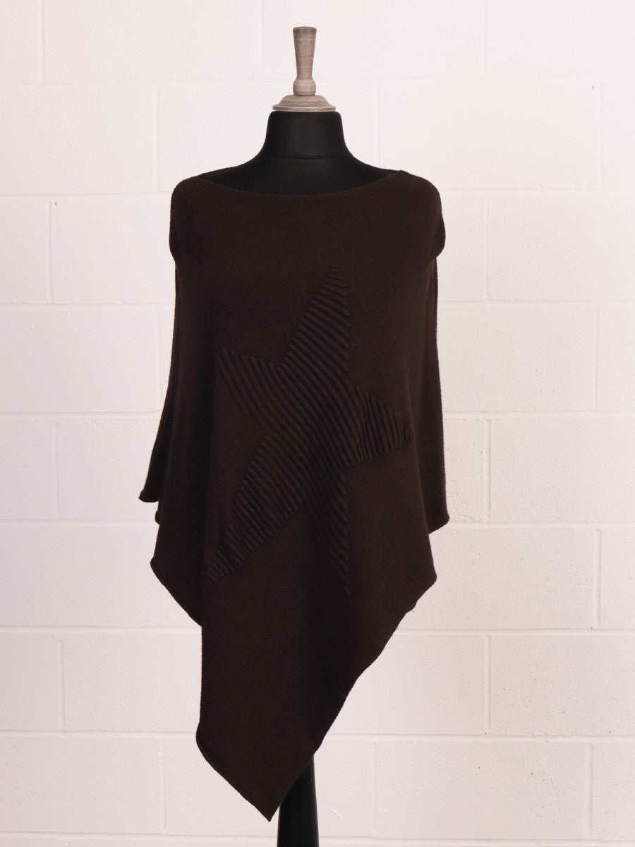 Crafted from a premium Italian wool blend, this chocolate ribbed star poncho offers exceptional warmth and refined texture. Its structured ribbing enhances durability while providing a flattering silhouette. Ideal for layering, it combines timeless style with expert craftsmanship, making it a versatile addition to any sophisticated wardrobe.