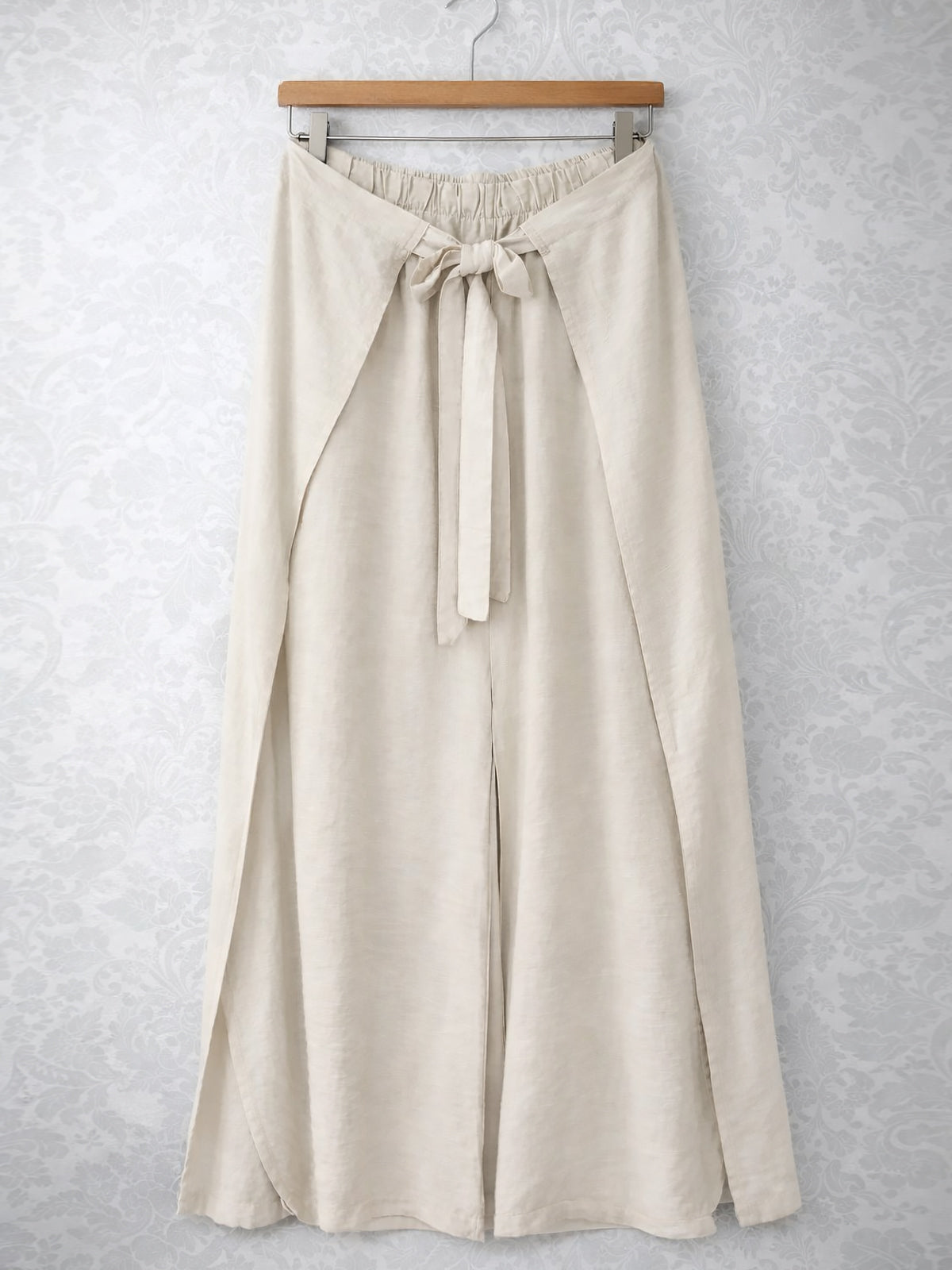 Crafted from premium Italian fabric, these wide-leg beige trousers combine contemporary design with refined elegance. The wrap front creates a flattering silhouette whilst the split hem adds modern movement to the legs. An adjustable tie waist ensures a customised fit for all body types. Perfect for elevating both professional and casual wardrobes, these trousers deliver sophisticated style with effortless versatility.