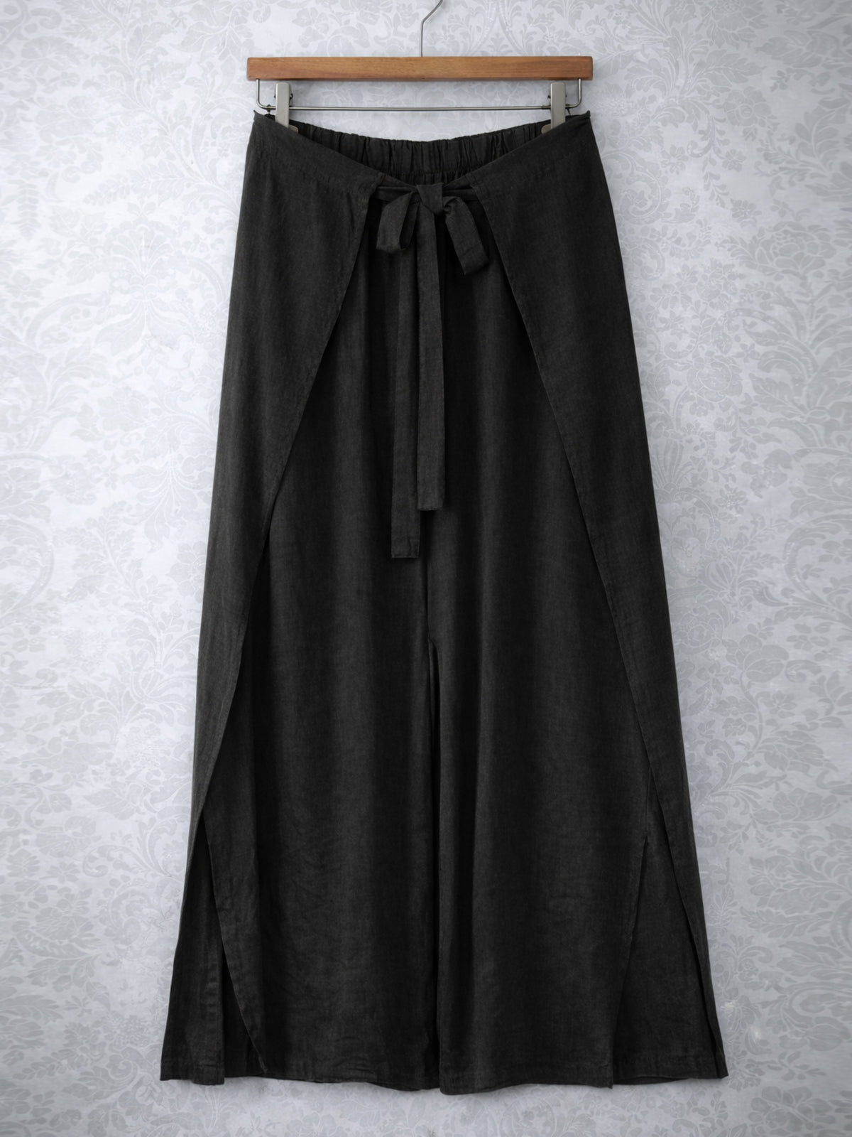 Crafted from premium Italian fabric, these wide-leg black trousers combine contemporary design with refined elegance. The wrap front creates a flattering silhouette whilst the split hem adds modern movement to the legs. An adjustable tie waist ensures a customised fit for all body types. Perfect for elevating both professional and casual wardrobes, these trousers deliver sophisticated style with effortless versatility.